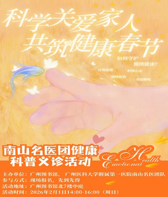 春节将至,团圆与欢聚之余,您是否也在为身心状态的调整而困扰?女性更年期的潮热失眠、长假前后的情绪波动与亲子关系紧张,常常成为影响生活质量与家庭和睦的“隐形压力”。如何科学调适身心,过好一个健康愉快的春节?为回应市民春节前后的健康需求,广州图书馆与广州医科大学附属第一医院南山名医团队携手推出“南山名医送健康”专场活动。活动特邀中医科主任医师李娟与临床心理科资深治疗师农苈莉,围绕“女性更年期调理”与“长假心理调适”两大主题,开展专题讲座与现场义诊,助力市民科学应对健康问题,共度平安祥和春节。讲座无需预约,免费开放。