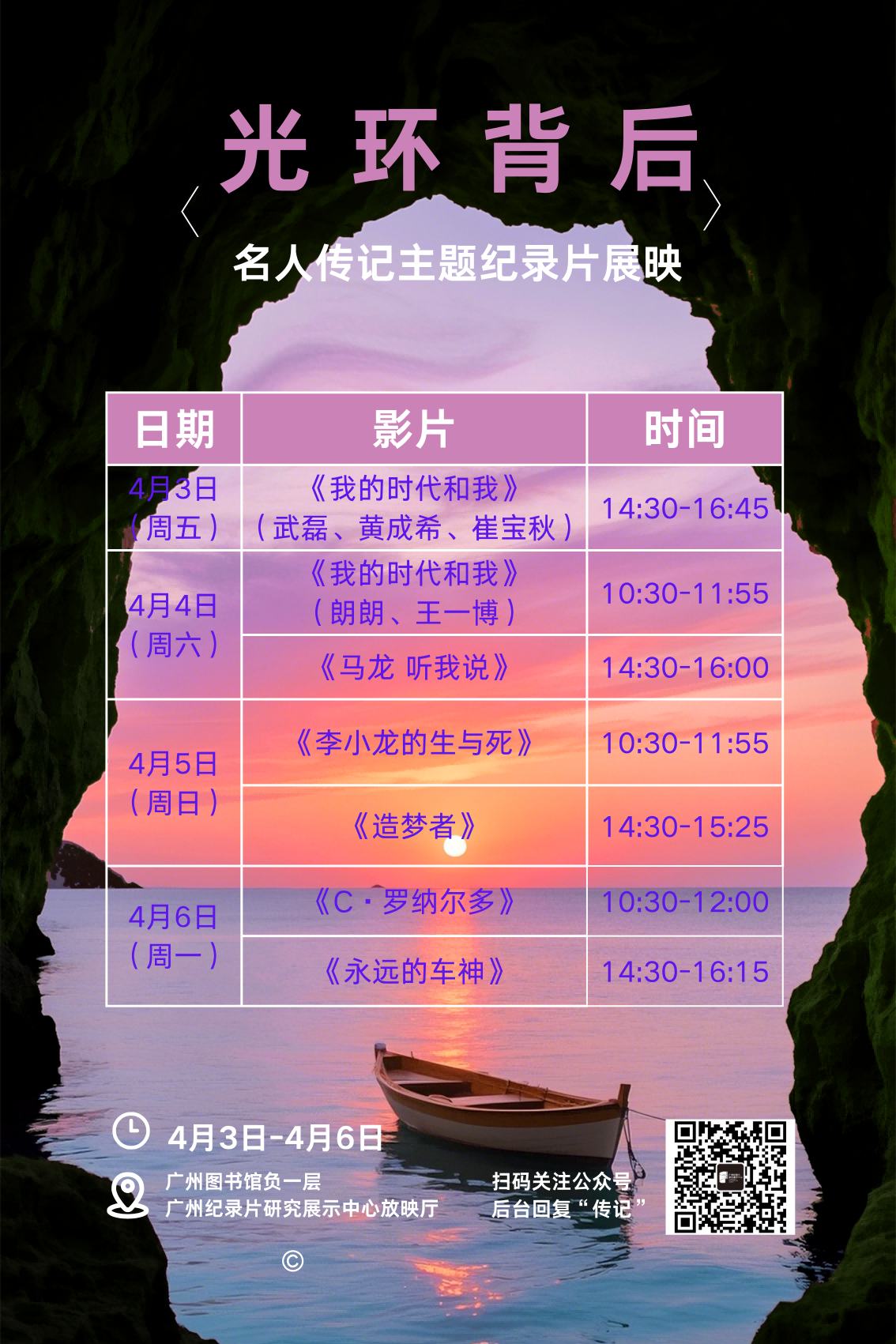 4月3日-6日,光环背后——名人传记主题纪录片展映,精选《我的时代和我》《马龙 听我说》《李小龙的生与死》《造梦者》《C·罗纳尔多》《永远的车神》6部人物主题纪录片,一起回顾他们的来时路,卸下名人身上的耀眼滤镜,直面他们不为人知的挣扎、坚守与逆袭。没有人能轻而易举登顶,每一份荣光,都藏着难以想象的辛苦与孤勇。