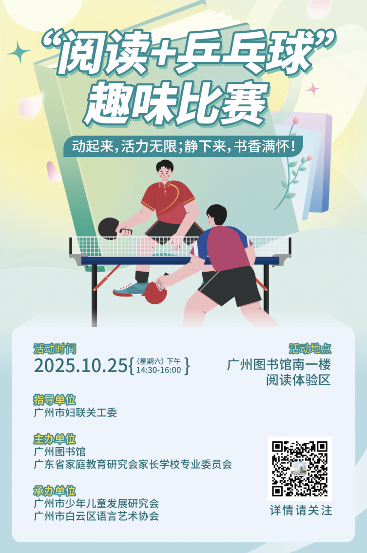 为创新阅读推广形式,营造积极健康、充满活力的学习氛围,迎接第十五届全国运动会的到来,广州图书馆学习强国馆将举办一场别开生面的“阅读+乒乓球”趣味比赛。本次活动将“学习强国”平台的知识性与乒乓球运动的趣味性相结合,旨在让读者在动静之间体验学习的乐趣,感受运动的激情。