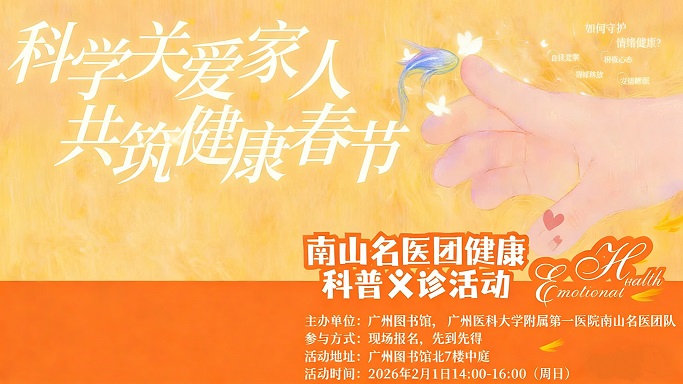 春节将至,团圆与欢聚之余,您是否也在为身心状态的调整而困扰?女性更年期的潮热失眠、长假前后的情绪波动与亲子关系紧张,常常成为影响生活质量与家庭和睦的“隐形压力”。如何科学调适身心,过好一个健康愉快的春节?为回应市民春节前后的健康需求,广州图书馆与广州医科大学附属第一医院南山名医团队携手推出“南山名医送健康”专场活动。活动特邀中医科主任医师李娟与临床心理科资深治疗师农苈莉,围绕“女性更年期调理”与“长假心理调适”两大主题,开展专题讲座与现场义诊,助力市民科学应对健康问题,共度平安祥和春节。讲座无需预约,免费开放。