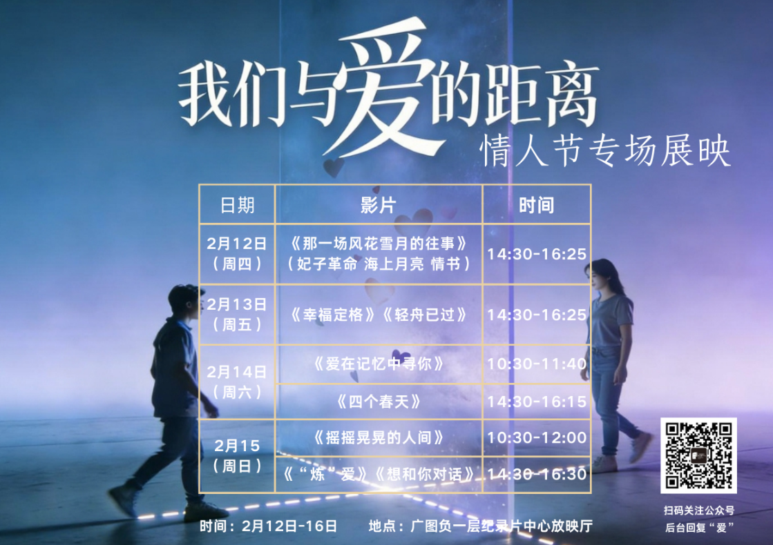 2月12日-16日,在情人节来临之际,我们将以“我们与爱的距离”,精选8部与爱和婚姻有关的纪录片与大家见面,《“炼”爱》聚焦当代年轻人的婚恋困境;《幸福定格》直击婚姻之初最真实的模样;《想和你对话》《轻舟已过》是成年孩子用镜头去观察父母的争吵与羁绊;《摇摇晃晃的人间》展现了女性勇敢执着走出婚姻困境的勇气;《四个春天》《爱在记忆中寻你》呈现了携手相伴到老的爱情模样。