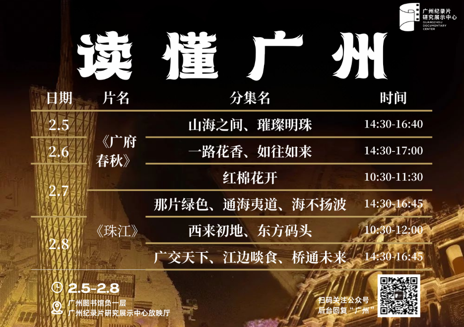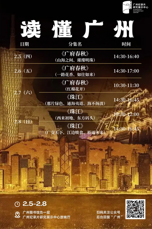 本周放映,我们将带您走进两部镌刻岭南基因的纪录片力作,探寻水脉与文明交织的记忆图谱。2月5日至7日放映系列纪录片《广府春秋》(1-5季),以文化地理视角,揭开岭南大地从山海相拥到现代都会的文明层积。镜头穿梭于千年古道、宗祠书院与沸腾的当代街巷,讲述岭南人如何在水系与季风中塑造出兼容并蓄、敢为人先的精神气质。2月7日至8日放映人文纪录片《珠江》(全8集),沿着一江春水,溯行三千里。从源头的一滴融水,到南海之滨的浩荡三角洲,影片以宏阔的生态叙事与人文观察,编织出一部流动的文明史诗。