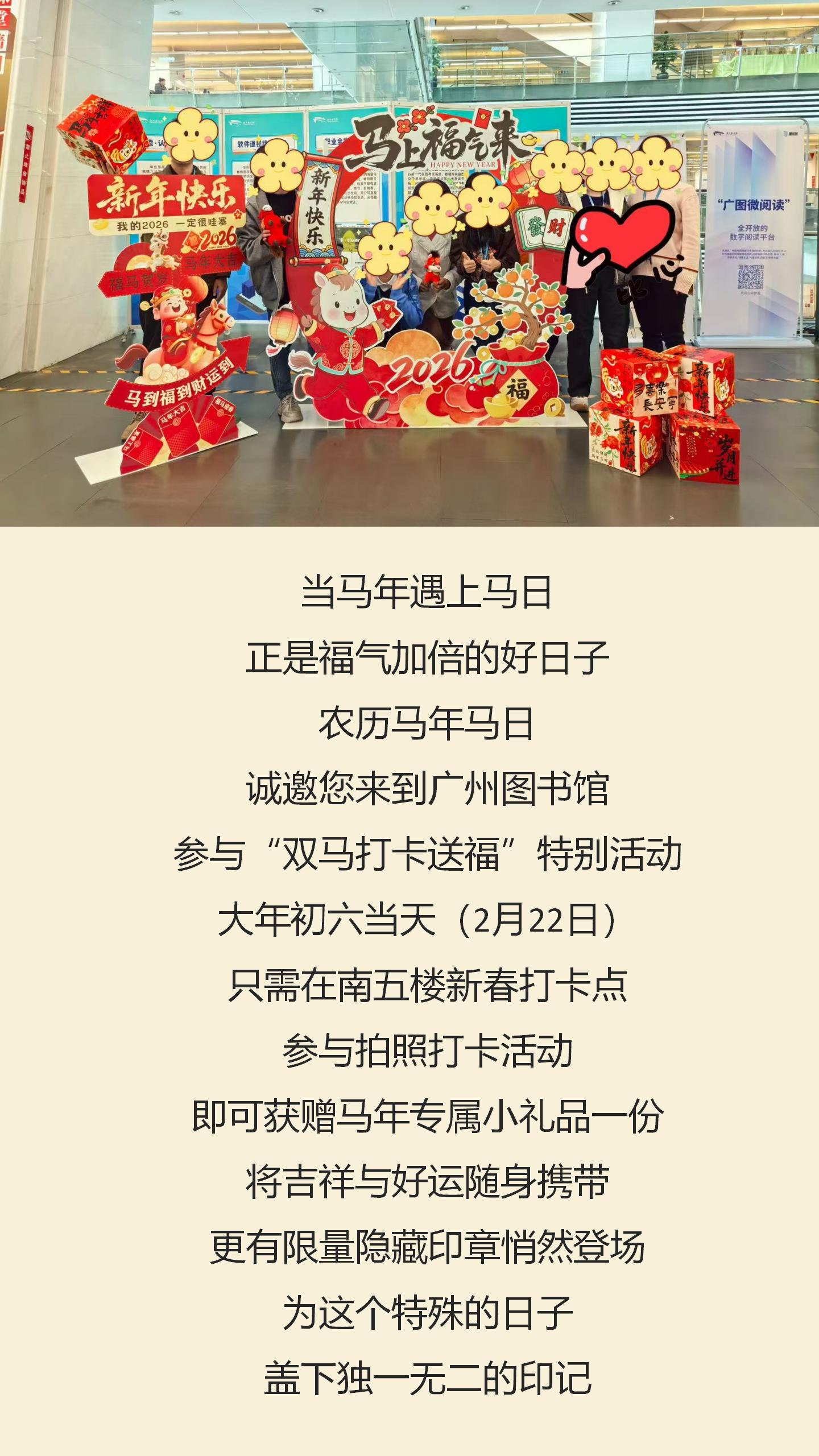 当马年遇上马日,正是福气加倍的好时辰!农历马年马日,诚邀您来到广州图书馆,参与“双马打卡送福”特别活动。大年初六当天(2月22日),只需在南五楼新春打卡点参与拍照打卡活动,即可获赠马年专属小礼品一份,将吉祥与好运随身携带。更有限量隐藏印章悄然登场,为这个特殊的日子,盖下独一无二的印记!