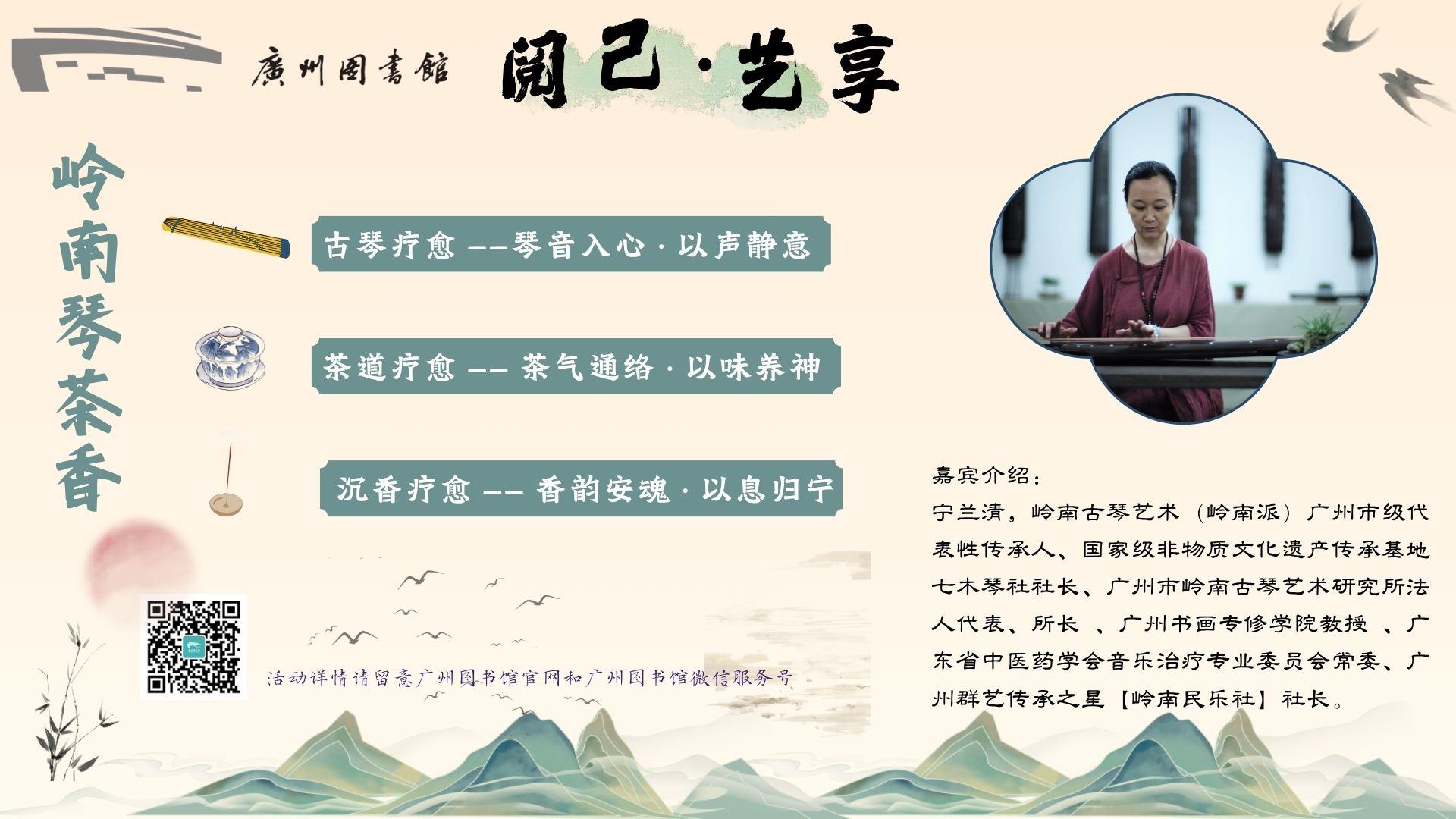 4月25日,第二场活动将在广州图书馆南一楼阅读体验区如约而至。我们延续“琴定心、茶润身、香安神”的核心理念,以及“香入境→书共读→琴养心→茶润身”的疗愈闭环。